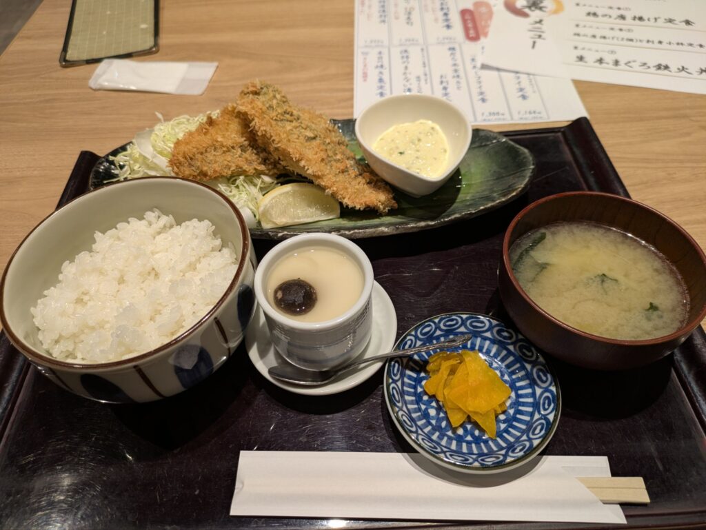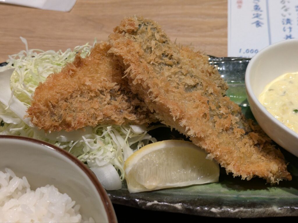 生アジフライ定食 生アジって?多分冷凍していないアジを使ったアジフライだろう 調べてないけど。