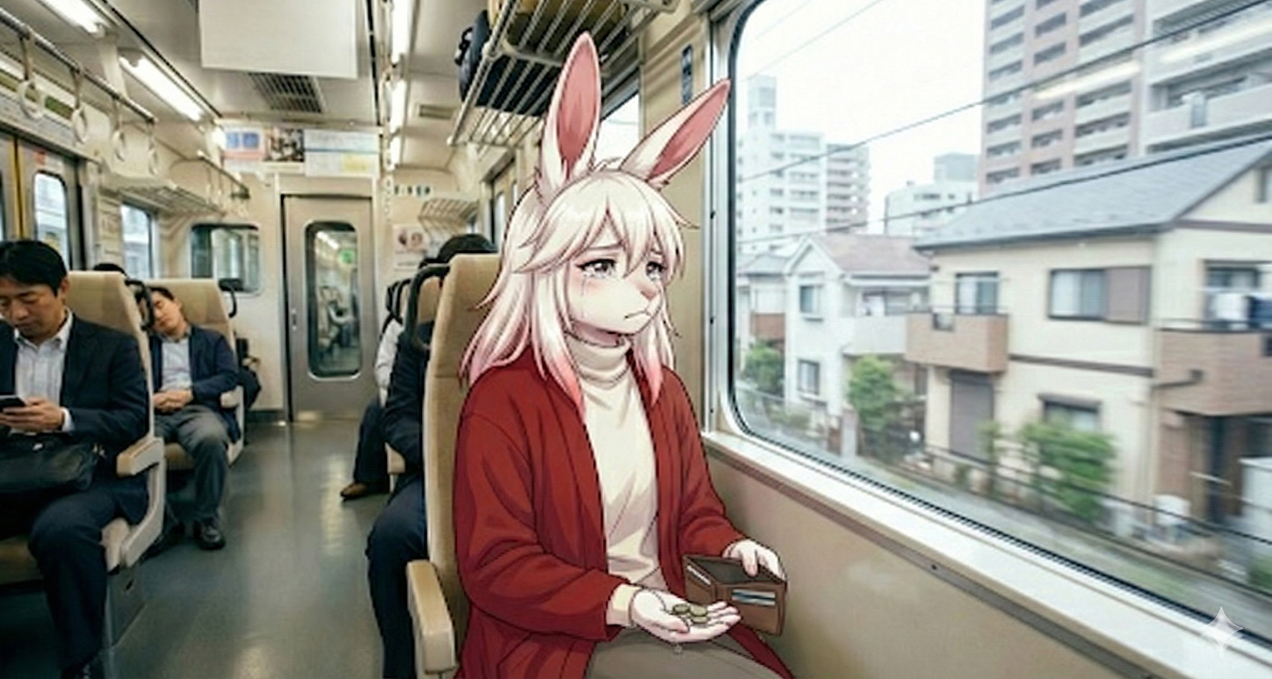 適当に 2026年2月11日 投稿者:赤雪兎 お金がないとツライよ 今千葉に来ている、電車に乗ってやってきた。 AI 作成画像 お金がなくて色々できない、辛い。 今朝3時頃に起きて来ていた服に財布を入れてしまっており、今の服装の中に財布がない状態 そう、移動に使っている携帯と一緒になっている、PASMO だけ、まあチャージはできるのでPASMO が使えれば色々できるのだろうが、そのお店がパスも使えるかどうか入らないとよくわからない、から使えない。 こんな感じになる予定だったのに、